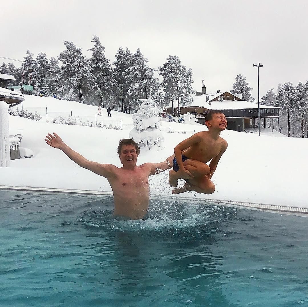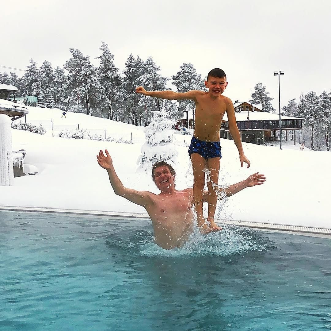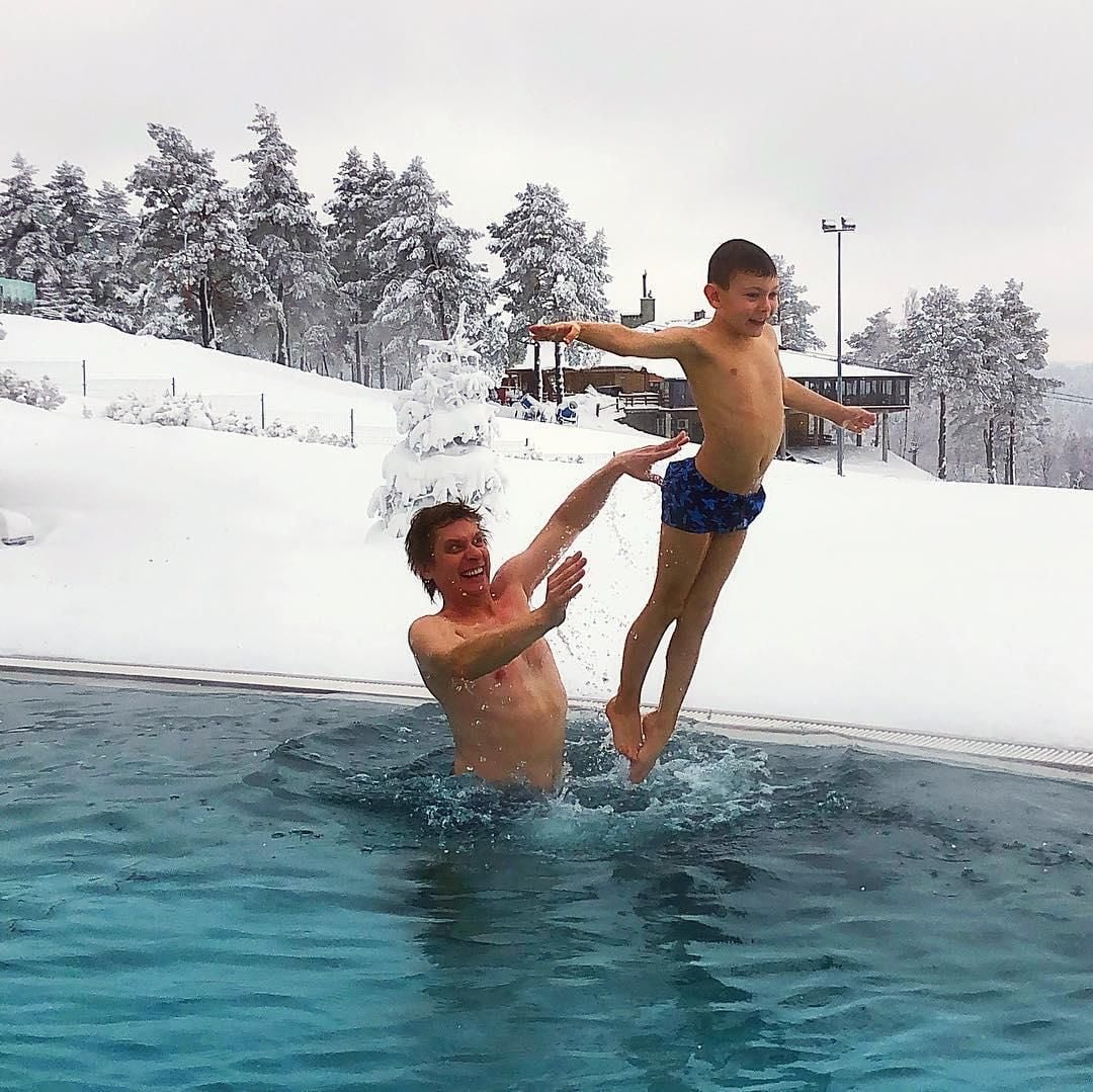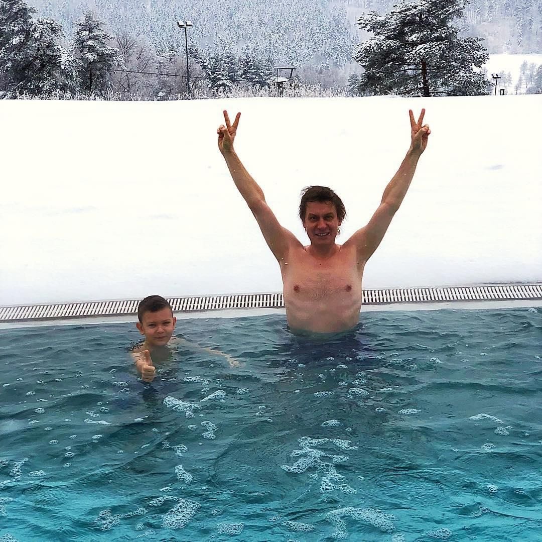 В бассейне среди заснеженных гор: Степан Казанин показал, как отдыхает с сыном