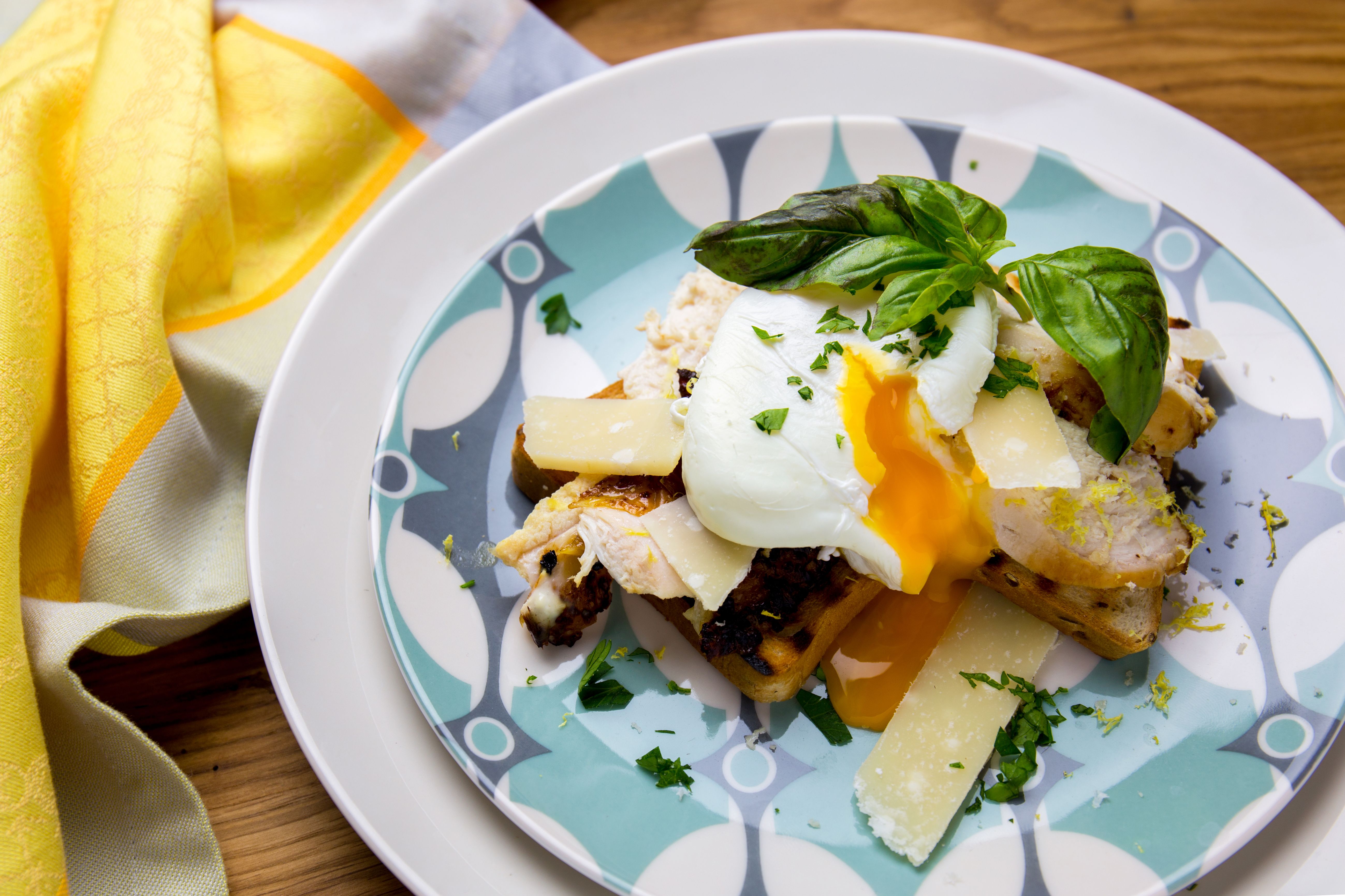 Уявімо ситуацію: ви приготували на Новий рік курку, і у вас залишилося м'ясо. Це перший крок до швидкого і дуже смачно сніданку з тостами, пармезаном і яйцем пашот.