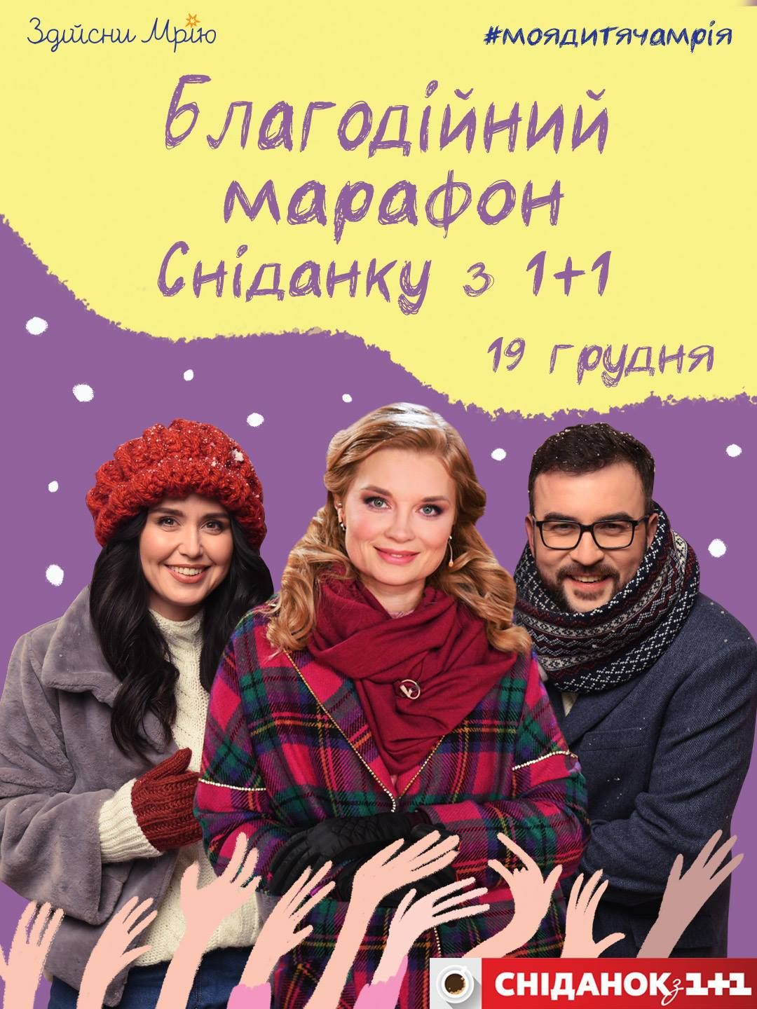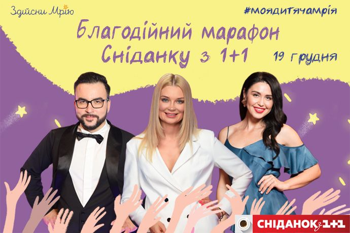 У День Святого Миколая, у середу 19 грудня, традиційно весь прямий ефір Сніданку з 1+1 стане благодійним марафоном. Команда ранкового шоу разом з проектом Здійсни мрію закликають українців долучитися до великого дива та допомогти зібрати кошти на здійснення мрій діток, які зараз боряться за своє життя.