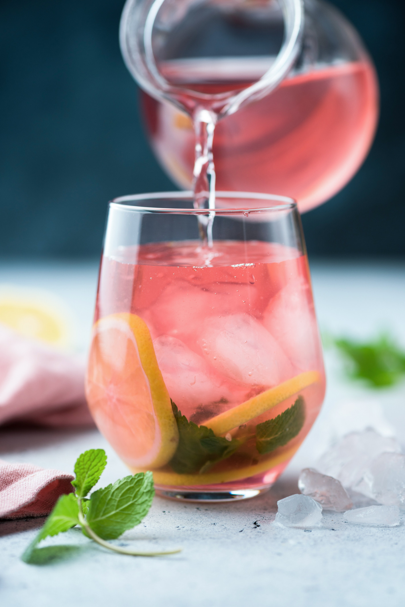 - Влити полуничний лимонад у глечик, додавши лимонний сік, лід і листя базиліку