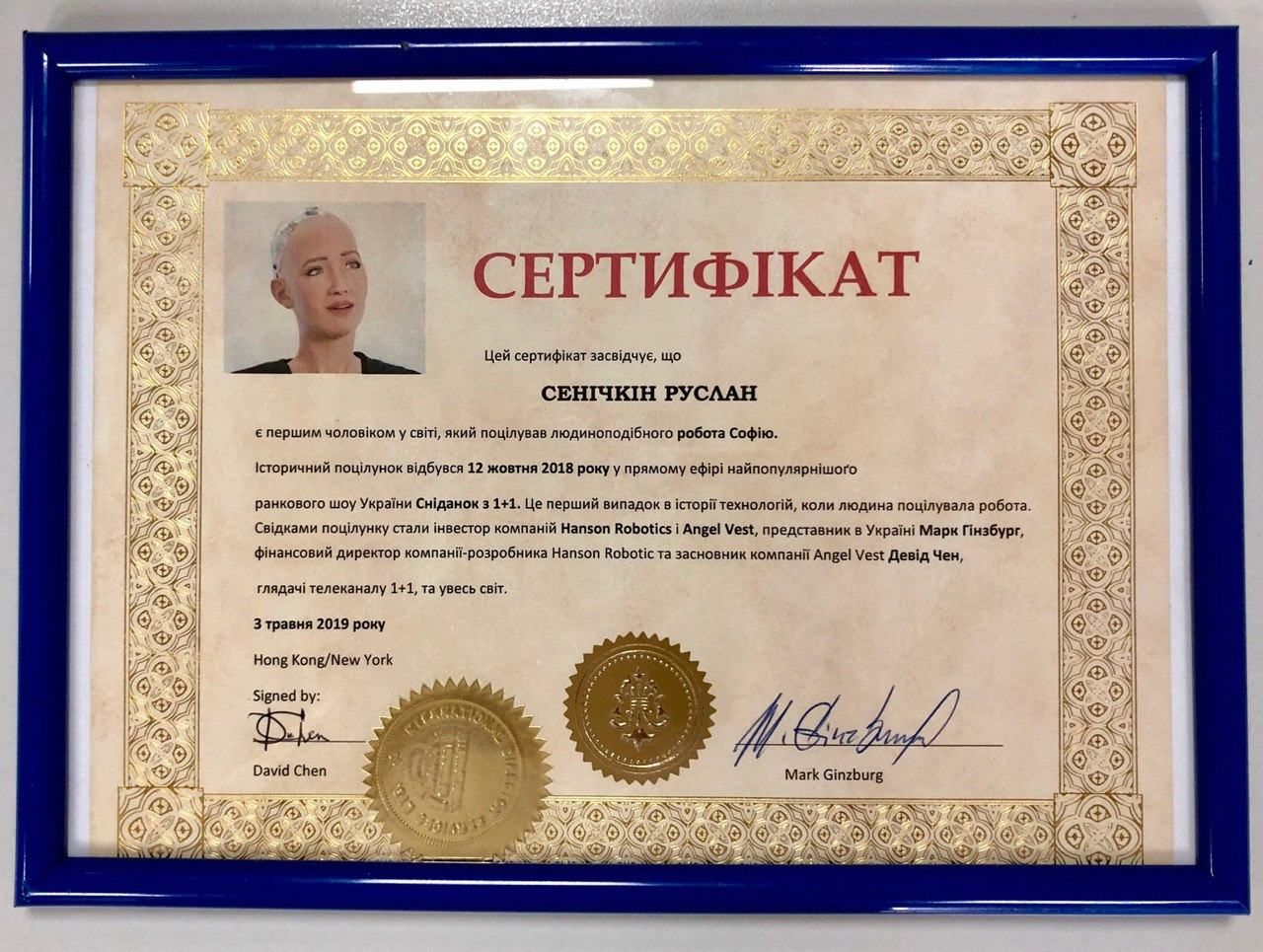 Сьогодні, 22 травня, у прямому ефірі ранкової програми Сніданок з 1+1 Руслану Сенічкіну вручили сертифікат, який затверджує, що він перший в світі чоловік, якому всесвітньо відомий робот Софія дозволила себе поцілувати! До цього робот Софія відмовила навіть голлівудському актору Віллу Сміту.