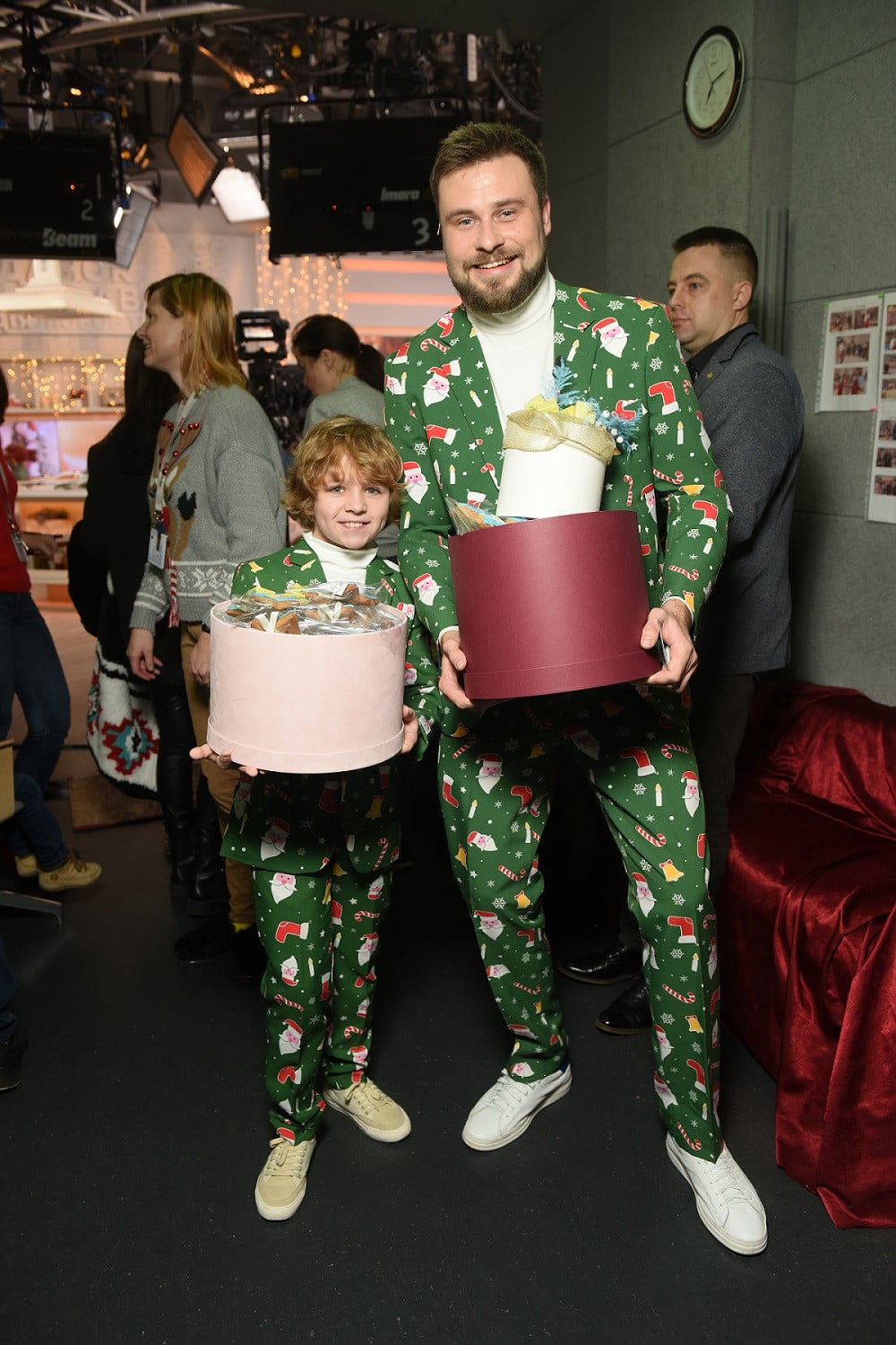 Єгор Гордєєв та Євген Лебедин перевтілилися в ельфів-помічників. У прямому ефірі вони з’явились в однакових костюмах яскравого зеленого кольору з новорічним принтом.