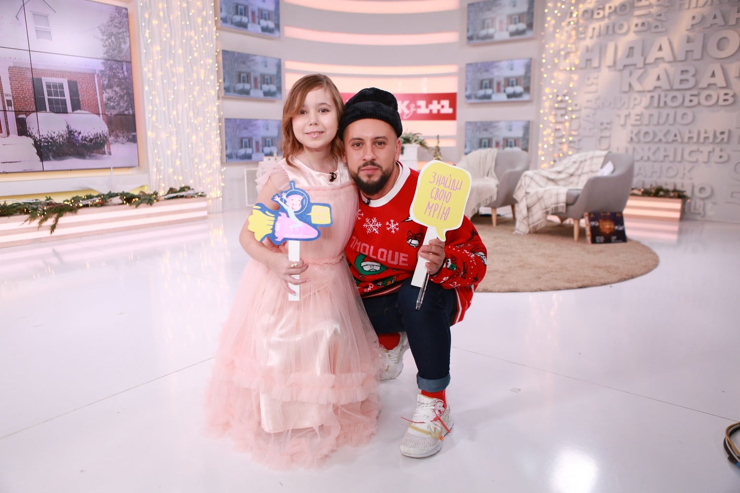 Jerry Heil завітала до студії у білому худі та широких штанах рожевого кольору. Традиційно співачка вражала стильним мейкапом, зробивши акцент на яскравих стрілках. У прямому ефірі молода співачка-блогер виконала пісню #моядитячамрія, яку подарувала проекту «Здійсни мрію».