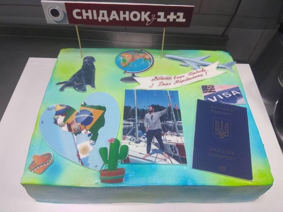 Після ефіру Єгора чекали гості, колеги, ведучі з подарунками і величезним mood тортом на якому розмістився глобус, карта Латинської Америки, де мріє побувати ведучий, яхта, літак, віза, закордонний паспорт.