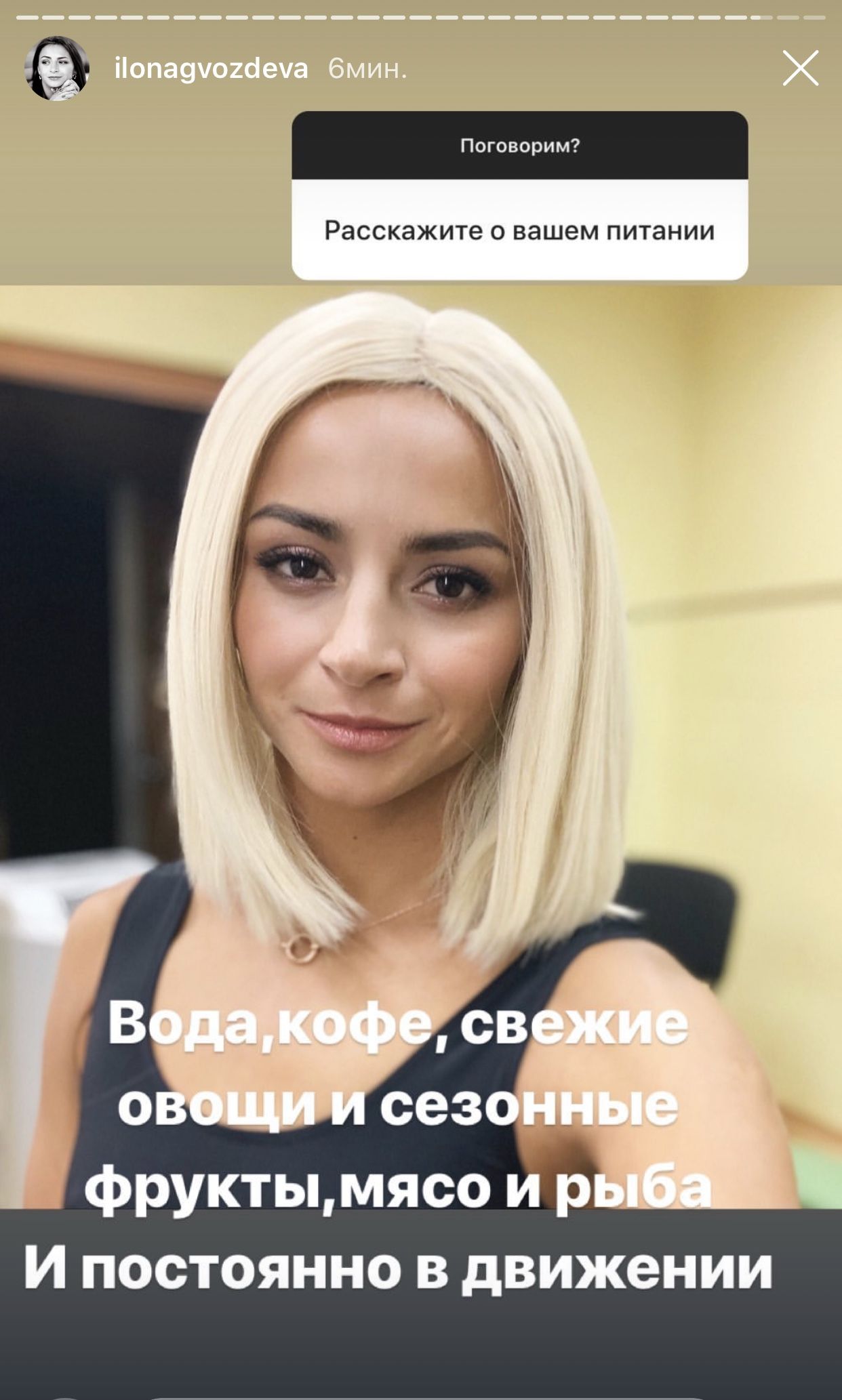 Танцівниця розповіла прихильникам про свій щоденний раціон. Він складається зі свіжих овочів і сезонних фруктів, м’яса та риби. Також упродовж дня Ілона п’є воду і дозволяє собі каву. При цьому запорукою красивої фігури залишається висока фізична активність.
