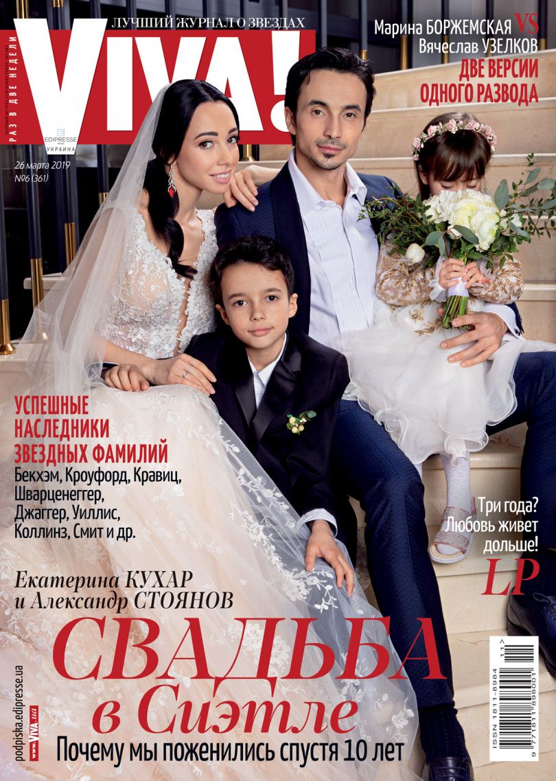 На обкладинці нового випуску журналу Viva! Катерина та Олександр позують у весільних образах. Поруч із закоханими батьками зображені їхні діти.