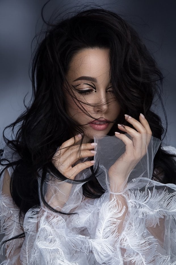 Заради зйомки зірка погодилася зняти вже вподобаний образ чорного лебедя та перевтілитися в ніжного білого. На світлинах Кухар позує в напівпрозорому крихітному боді, оздобленому білим пір’ям, а також у легкій жіночній сукні. Чуттєві образи нагадують весільні вбрання балерини.