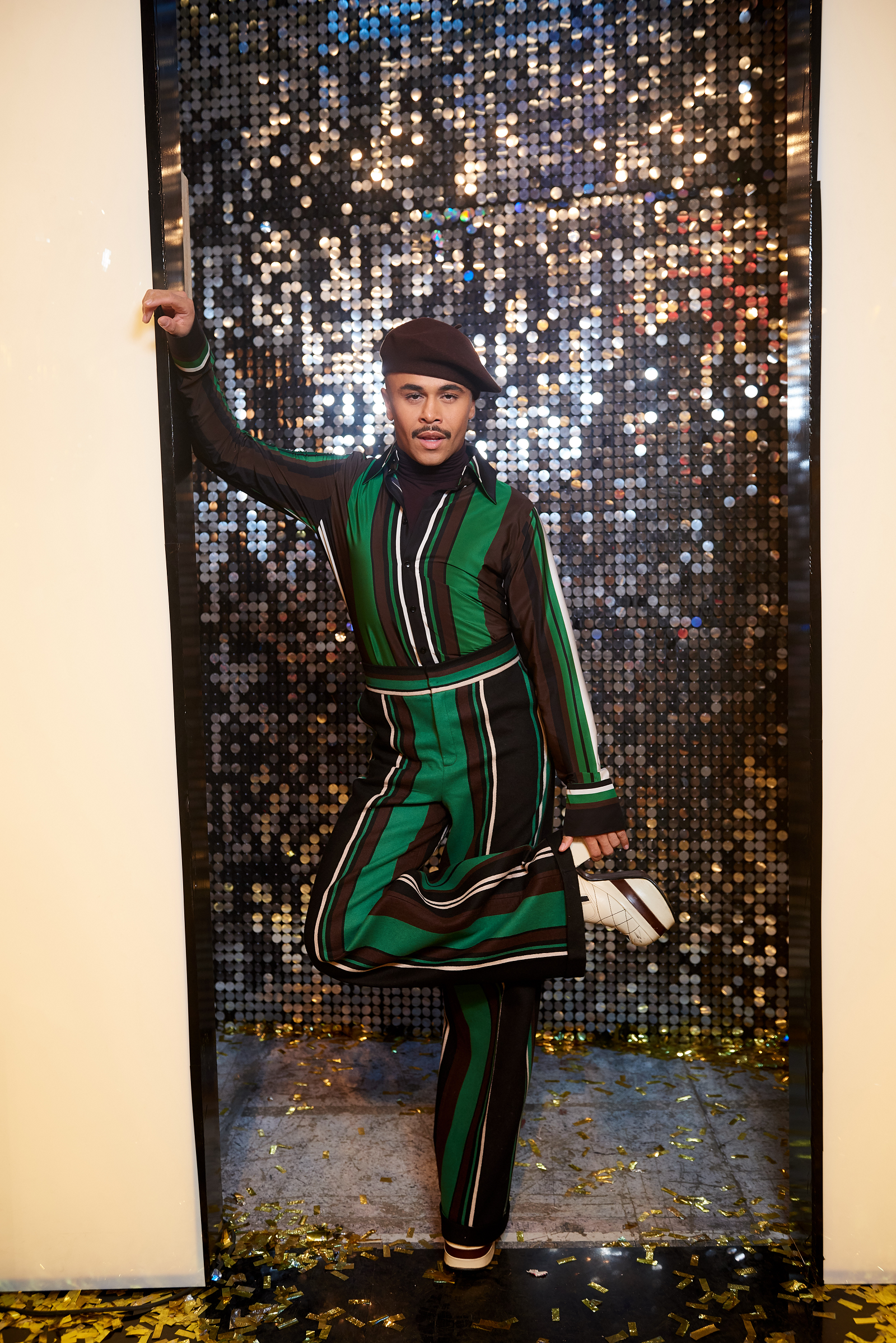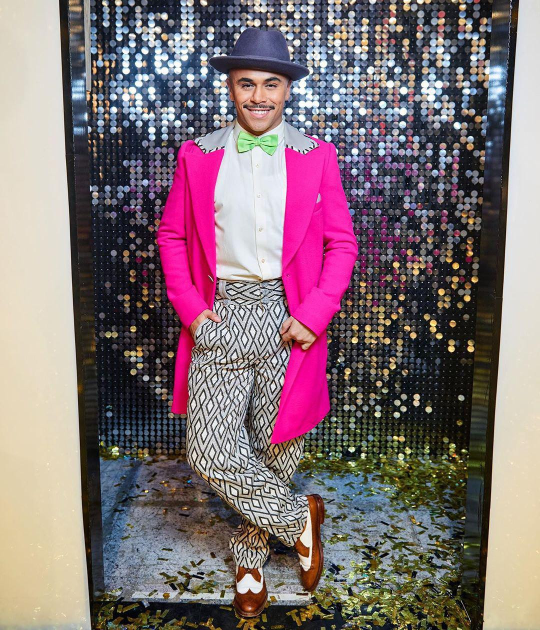 #10 В одинадцятому ефірі танцівник зачарував глядачів луком у блискучих барвах. Хореограф обрав подовжений піджак кольору фуксії, світло-салатовий метелик, штани з улюбленим геометричним принтом та темно-блакитний капелюх.