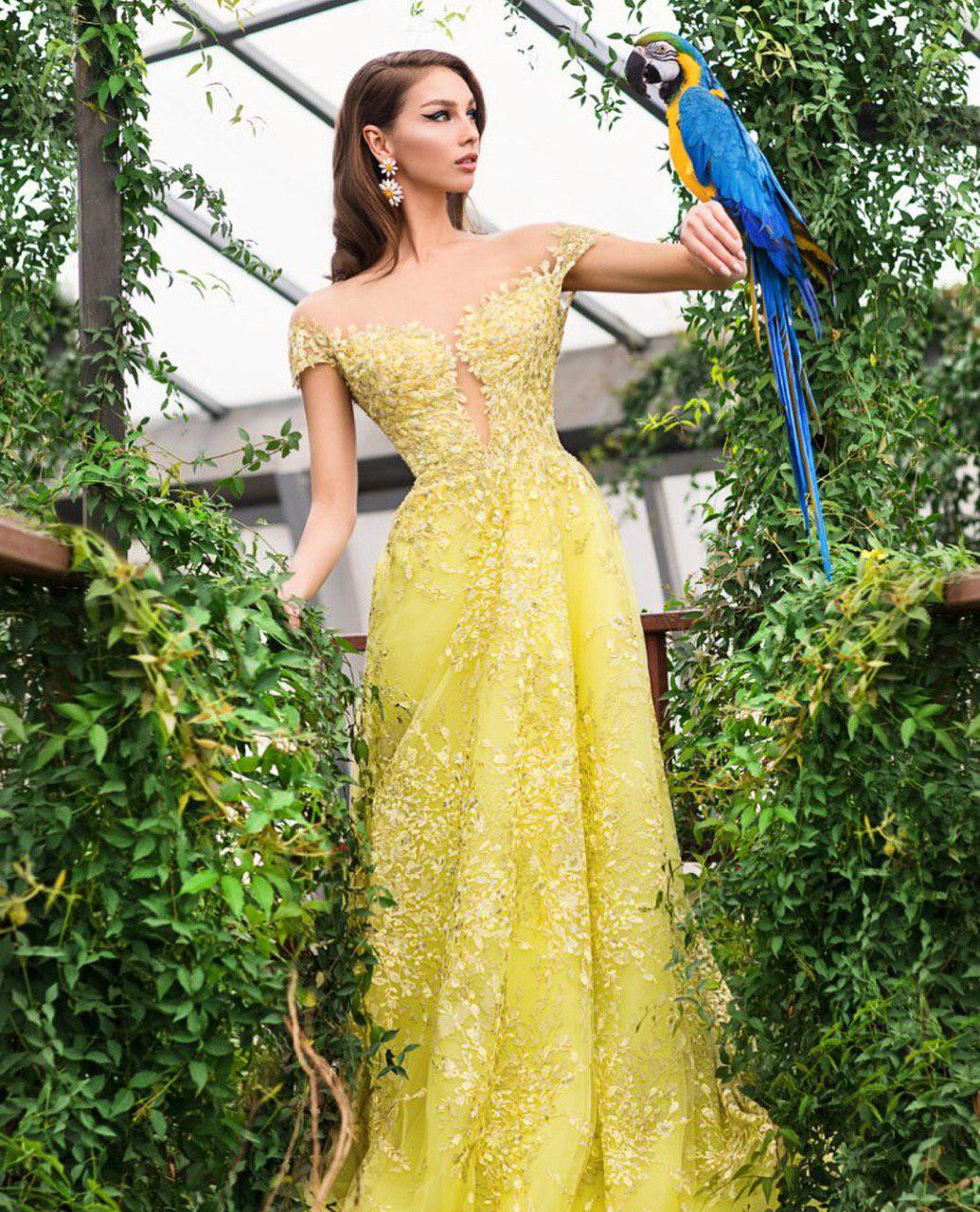 Найяскравішою і хвилюючою для мене була зйомка з папугою Ара. Це досить великий і неймовірно красивий птах. Важить папуга 4 кг. Під час зйомки я стояла на високих підборах, в довгій вечірній сукні, а папуга сидів на руці. І мені потрібно було розслабитися, красиво усміхатися, робити вигляд, що мені зовсім не важко і не страшно.