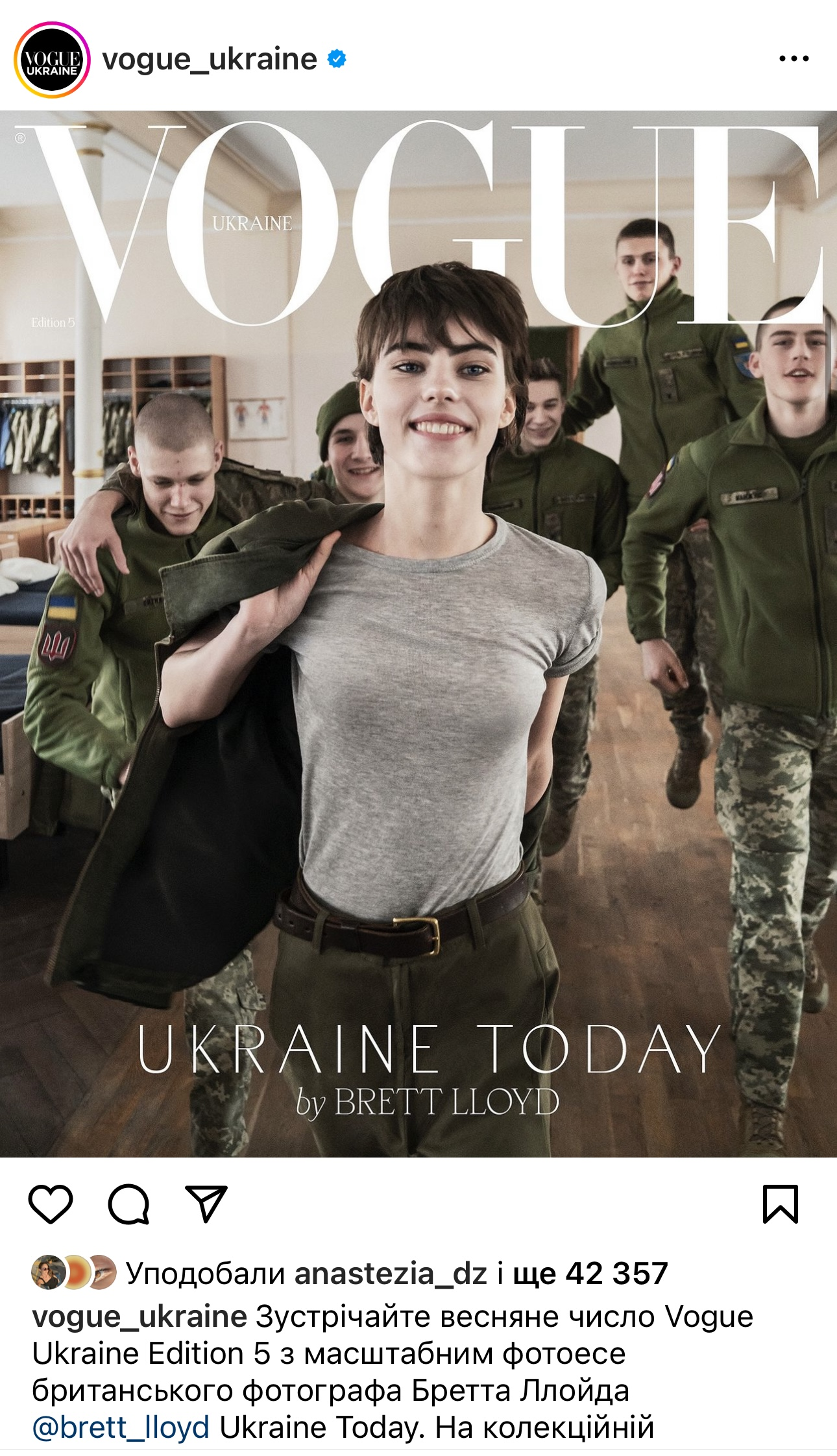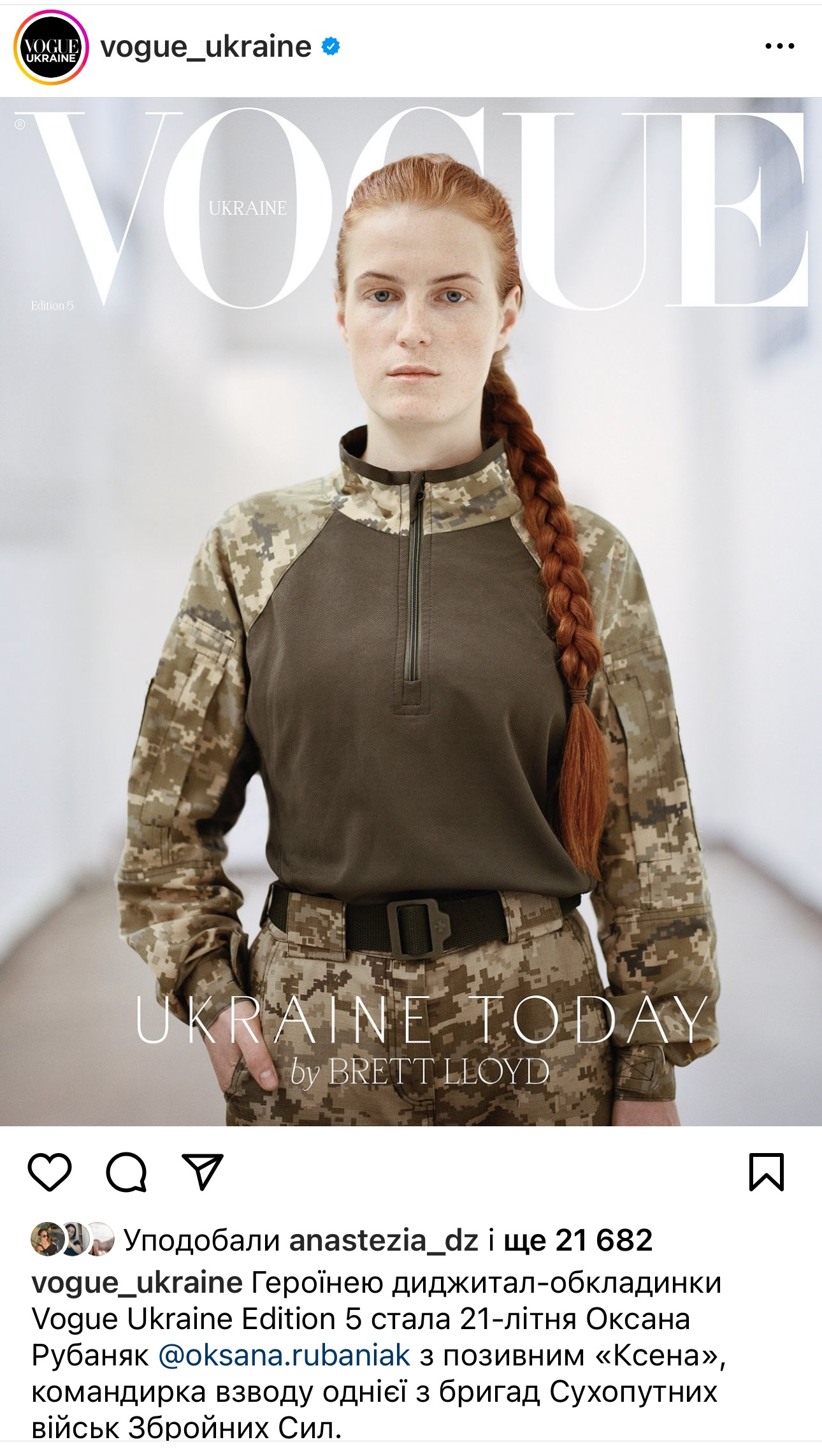 Український VOGUE випустив 2 обкладинки з жінками-військовими. Задум втілив відомий на весь світ фотограф Бред Ллойд. Оксана Рубаняк, командирка взводу одної з бригад Сухопутних військ України, стала першою моделлю для обкладинки.
