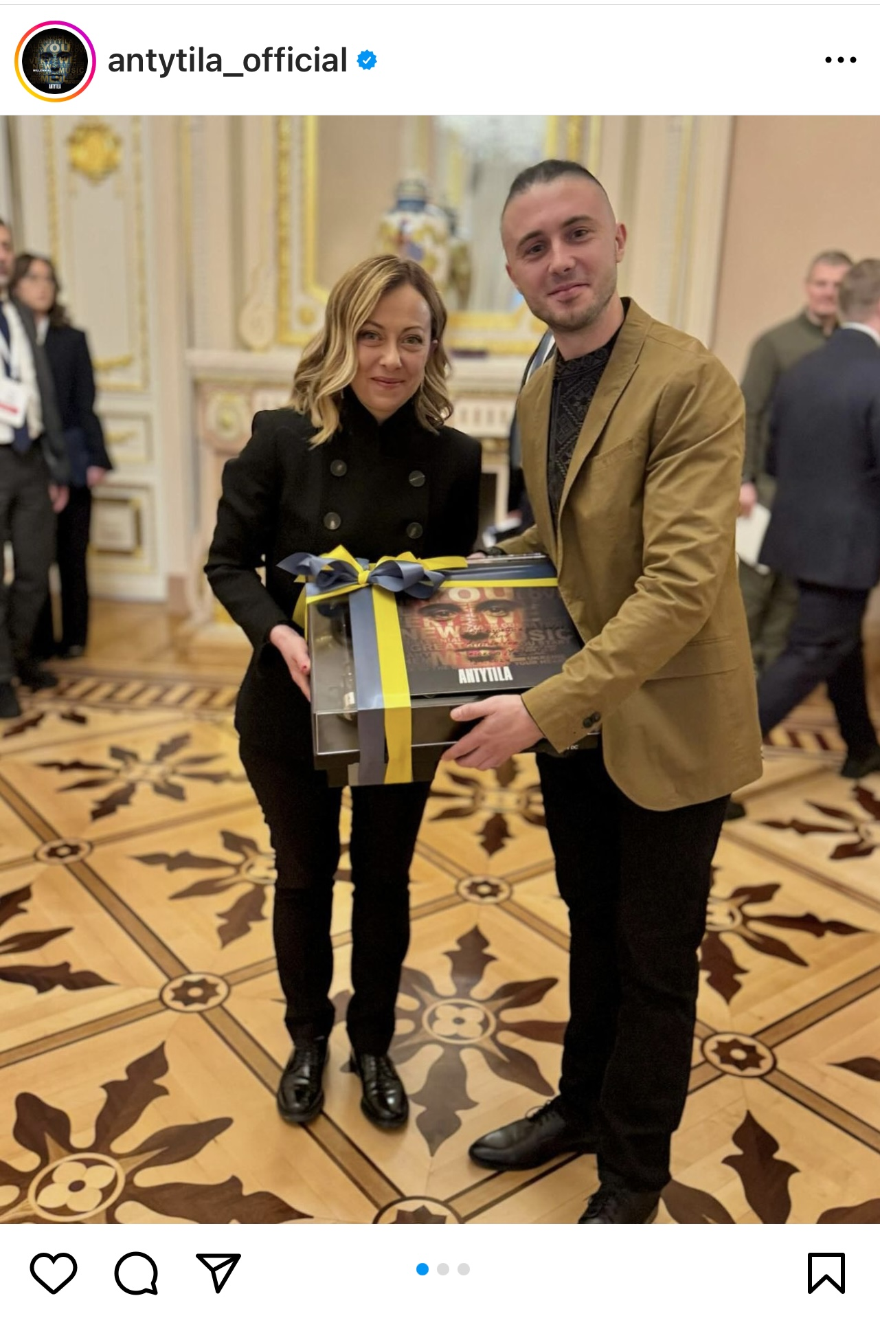 Премʼєрка Італії Джорджа Мелоні вручила престижну нагороду відомому українському гурту "Антитіла". Виявляється, премʼєрка є прихильницею їхньої творчості. А пісня "Фортеця Бахмут" настільки зачепила італійку, що вона вивчила її напамʼять. Тарас Тополя - соліст гурту, подарував Мелоні збірник пісень "Антитіл" та вініловий програвач.